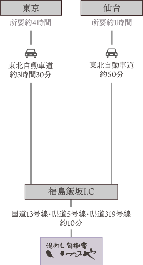 - ■東京から東北自動車道(約3時間30分)→福島飯坂I.Cから国道13号線・県道5号線・県道319号線(約10分)→いづみや